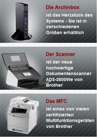 Hier ist die neue revolutionäre Archivbox für alle BSI-fähigen Brother Multifunktionsgeräte (MFCs) und Scanner. Sie erweitert den Umfang der 4in1 Geräte um die fünfte Funktion: einfachstes digitales Archivieren.